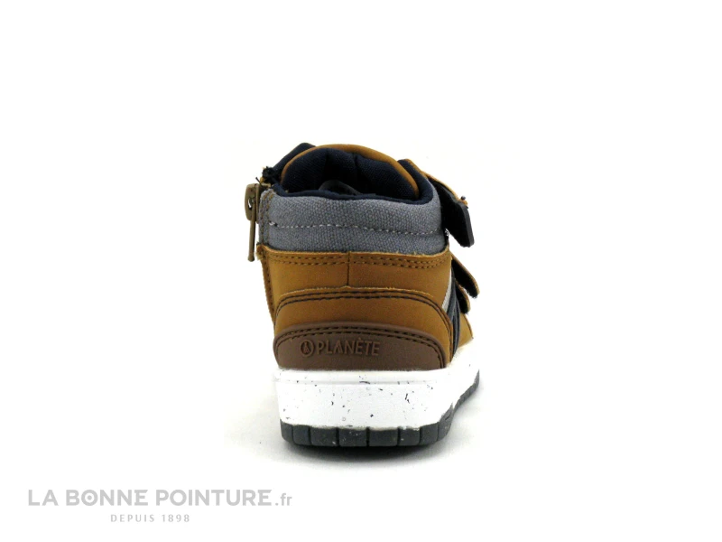 Ce bottillon garçon éco-responsables Alma Planete Eckos est en simili cuir marron clair (camel), avec une toile grise sur le haut.