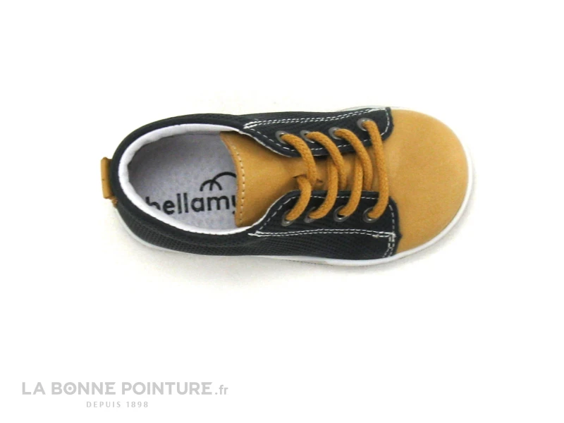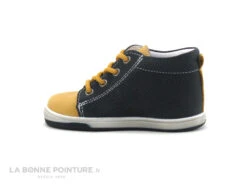 Ce bottillon premiers pas Bellamy combine un cuir bleu marine aspect poinçonné et un cuir jaune moutarde.