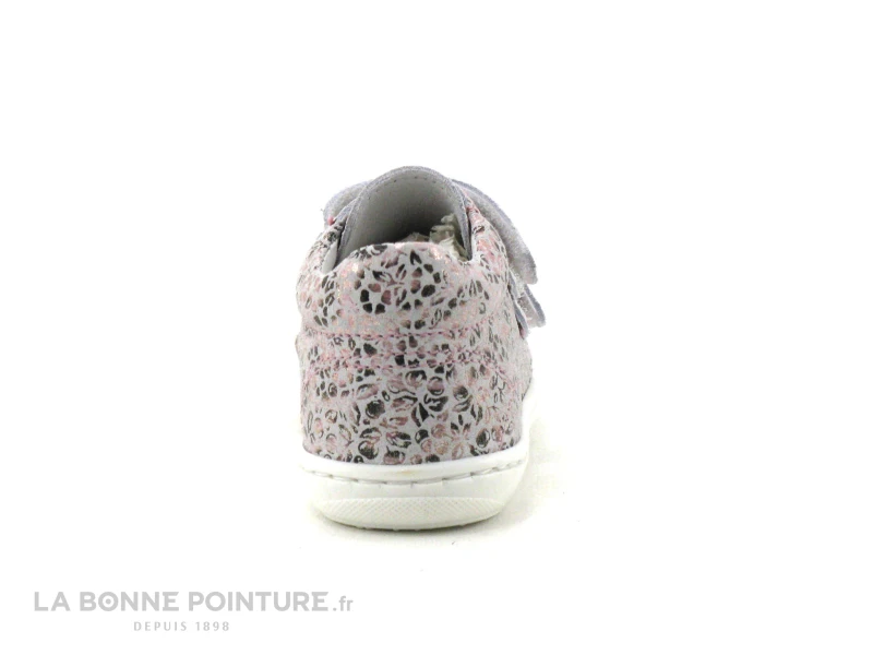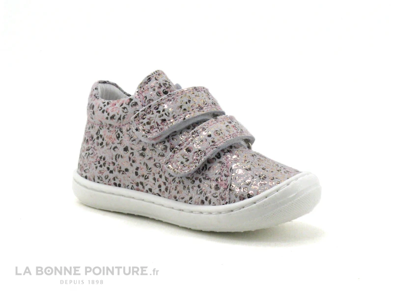 Cette chaussure montante fille à scratches Bellamy est en cuir velouté Liberty, imprimé floral rose et noir sur fond gris clair, avec des reflets argentés.