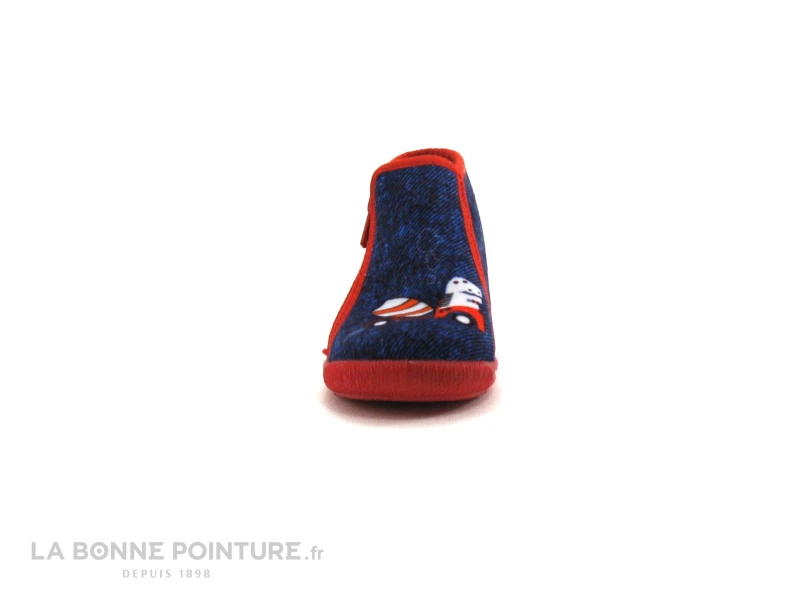 Cette pantoufle enfant Bellamy est en textile veloutĂ© bleu jean, avec le pourtour rouge et un camion de chantier sur l’avant.