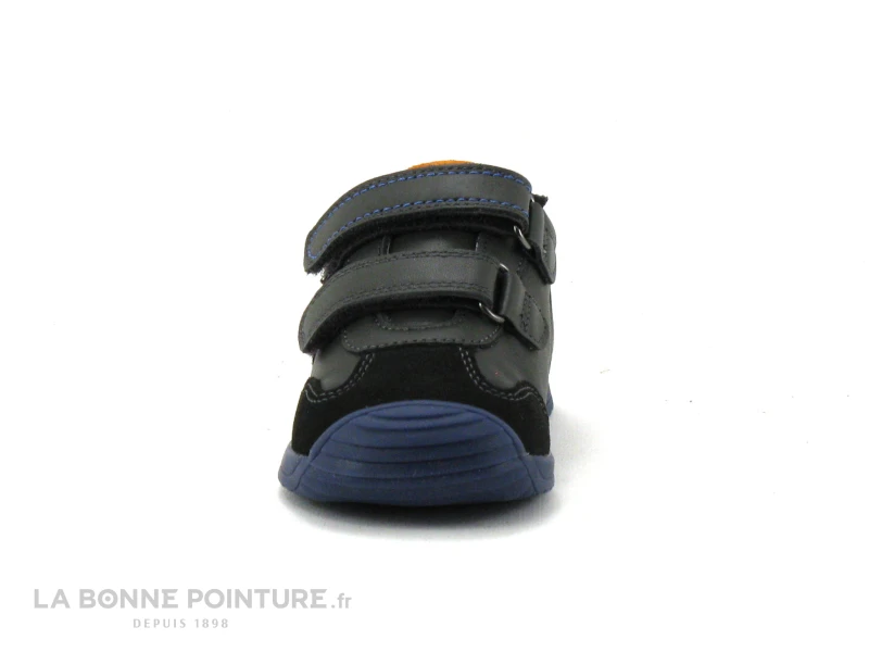 La chaussure montante bĂ©bĂ© Biomecanics 211133B mĂ©lange un cuir lisse et un cuir veloutĂ©, aux tons de gris, de noir et d’orange.