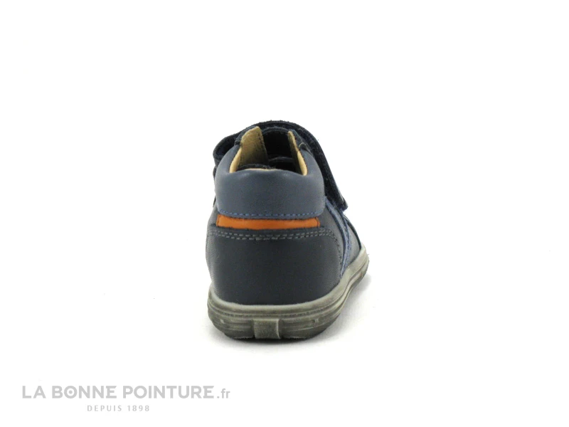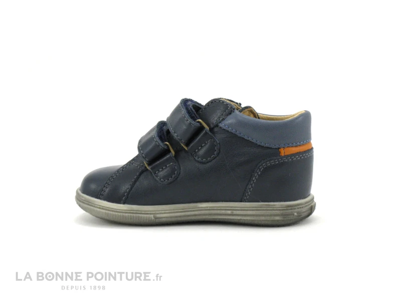 Cette chaussure semi montante bĂ©bĂ© Bopy Zavovel est en cuir lisse bleu marine, ornĂ©e d’un peu de bleu jean et d’orange.