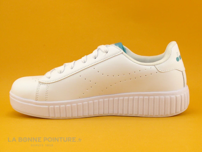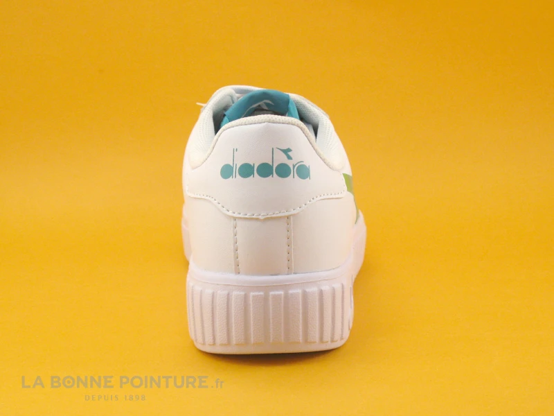 Ces sneakers fille-femme sont en simili cuir blanc, avec la languette verte le logo de la marque Diadora et vert hologramme sur un cÎté.