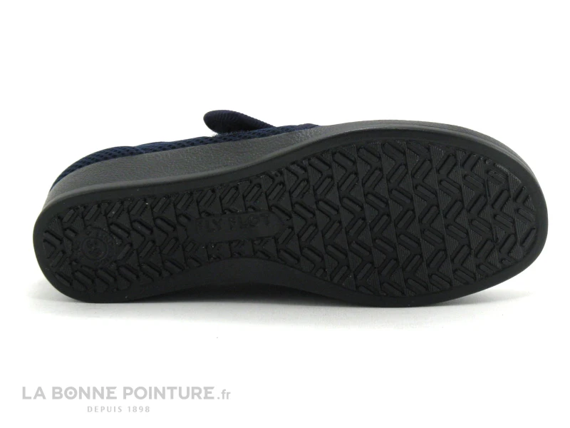 Cette pantoufle Femme fermée par velcro est en tissu maille et nylon bleu marine.