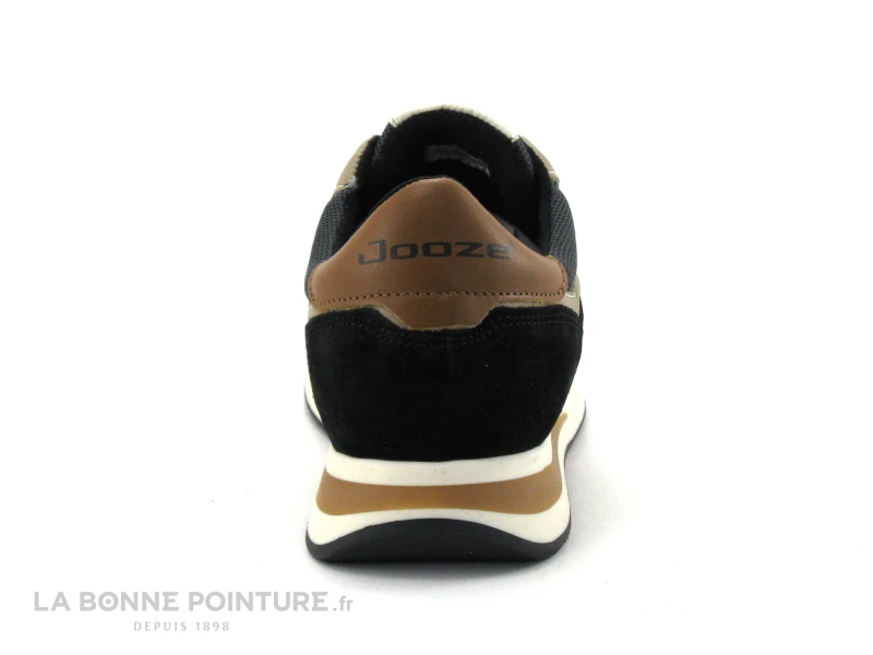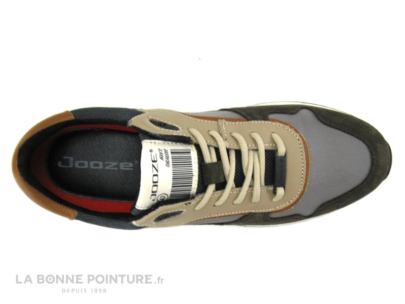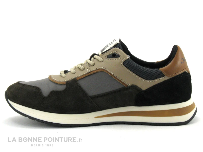 Cette basket de ville Homme Jooze associe cuir et textile, aux tons de marron, de beige, de noir et de gris.
