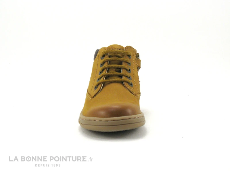 Cette chaussure montante garçon Kickers est en cuir aspect peau de pĂȘche marron clair (camel), avec la pointe et le contrefort plus foncĂ©s.