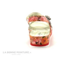 Ce nu-pieds mode Femme avec semelle lĂ©gĂšre mĂ©lange deux imprimĂ©s, l’un tachetĂ© de bleu et d’orange sur fond blanc et l’autre aux tons de rouge, de rose et de bordeaux.
