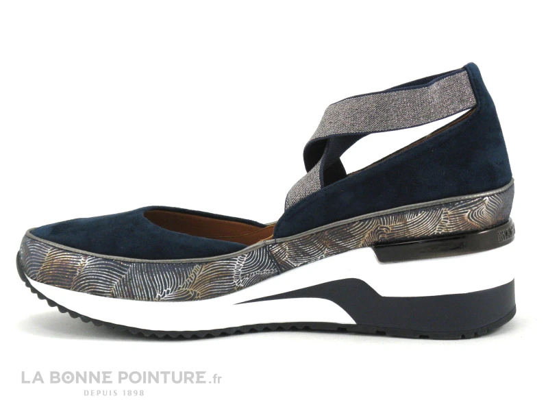 Cette chaussure à talon compensé MamZelle Volou navy est en cuir velours bleu marine, avec la base bronze, or et argent sur fond bleu marine.