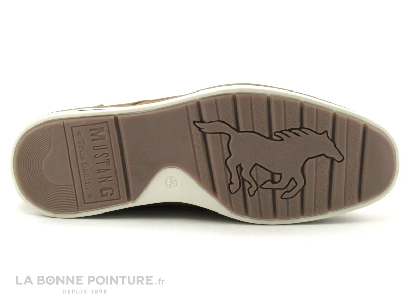 La semelle de marche du derby Homme marron est souple et assez lĂ©gĂšre, avec la marque Mustang en relief Ă l’arriĂšre.