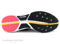 Cette basket running Homme Puma Nitro Electrify est en tissu mesh léger et respirant noir, avec la semelle rose et jaune.