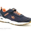 Cette basket Skechers 403951 lavable en machine est en maille et matiĂšres synthĂ©tiques, aux tons de noir, de bleu, de vert et d’orange.