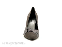 Cet escarpin bout pointu et talon haut est en cuir veloutĂ© beige, avec un bandeau plissĂ© et nouĂ© sur l’avant gris mĂ©tallisĂ©.