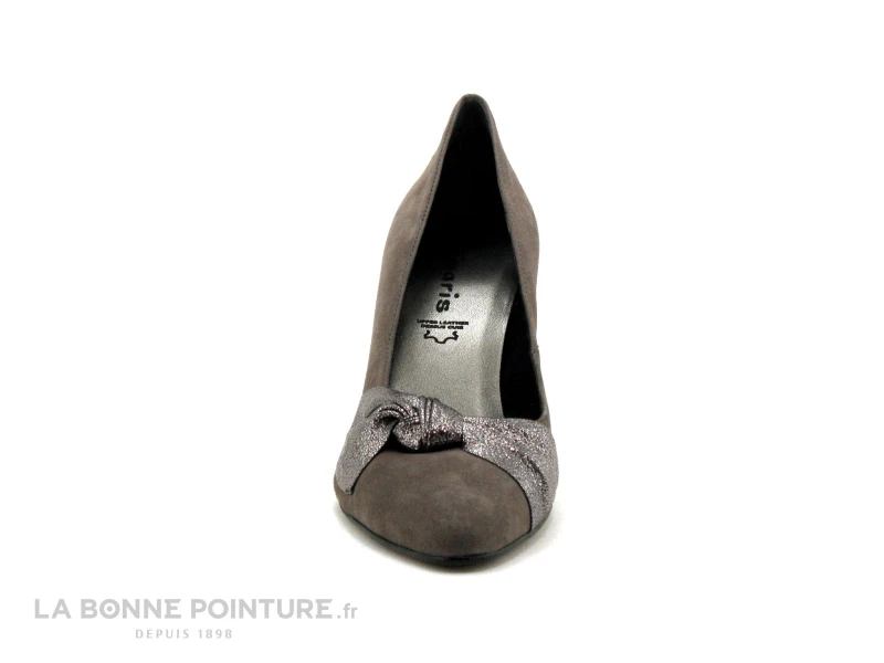 Chics et fantaisie avec leur cuir velours beige et leur drapé argent, les escarpins à talon aiguille Tamaris 1-22428-21 stone pewter metal !