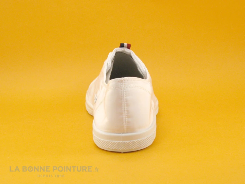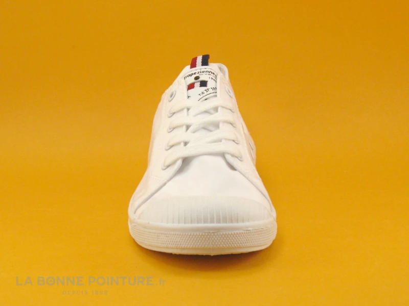 Cette basket Femme Les Tropézienne Chana par M. Belarbi est en nylon blanc satiné, avec un ruban bleu blanc rouge sur la languette associé à un écusson marqué Les Tropéziennes.