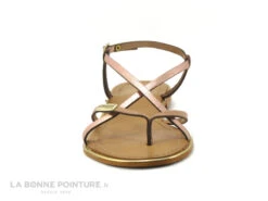 Ces sandales Femme avec entre-doigt Tropéziennes 42713 mélangent un cuir rose métallisé effet craquelé, un cuir nude et un cuir marron.
