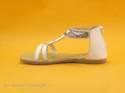 Deux brides habillent la cheville, l’une avec des perles argentĂ©es et l’autre avec une boucle mĂ©tallique.